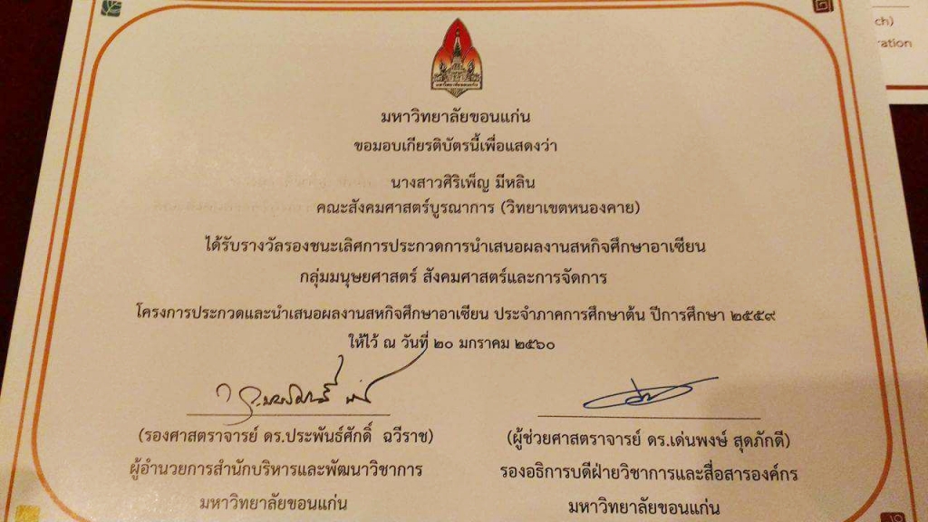 นางสาวศิริเพ็ญ มีหลิน นักศึกษาชั้นปีที่ 4 สาขาวิชารัฐประศาสนศาสตร์ คณะสังคมศาสตร์บูรณาการ มหาวิทยาลัยขอนแก่น วิทยาเขตหนองคาย ได้รับรางวัลรองชนะเลิศ การนำเสนอผลงานสหกิจศึกษาอาเซียน (นำเสนอเป็นภาษาอังกฤษ) เรื่อง กฏหมายในชีวิตประจำวันสำหรับประชาชนลาว กลุ่มมนุษศาสตร์ สังคมศาสตร์และการจัดการ โดยมีผู้ช่วยศาสตราจารย์ อนุชา นิลประพันธ์ และอาจารย์ปัณฑารีย์ อินยา เป็นอาจารย์ที่ปรึกษา ในโครงการประกวดและนำเสนอผลงานสหกิจศึกษาอาเซียน ประจำภาคการศึกษาต้น ปีการศึกษา 2559 ซึ่งจัดโดยสำนักบริหารและพัฒนาวิชาการ มหาวิทยาลัยขอนแก่น เมื่อวันที่ 20 มกราคม 2560 ณ โรงแรมพลูแมน ขอนแก่น ราชา ออคิด ในปีนี้มหาวิทยาลัยขอนแก่น วิทยาเขตหนองคาย มีนักศึกษาจากคณะสังคมศาสตร์บูรณาการเข้าร่วมนำเสนอผลงานทั้งหมด 7 คน แบ่งเป็นสาขาวิชารัฐประศาสนศาสตร์ 6 คน และสาขาวิชาเศรษฐศาสตร์ 1 คน