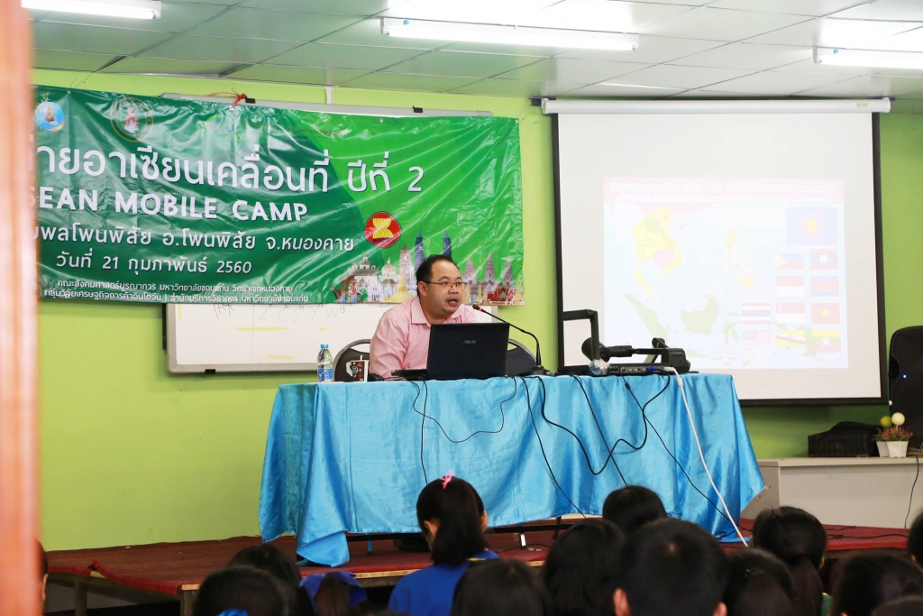 วันที่ 21-22 กุมภาพันธ์ 2560 สาขาเศรษฐศาสตร์ คณะสังคมศาสตร์บูรณาการ มหาวิทยาลัยขอนแก่น วิทยาเขตหนองคาย ร่วมกับกลุ่มวิจัยเศรษฐกิจการค้าระหว่างประเทศอินโดจีน และสำนักบริการวิชาการ จัดโครงการค่ายอาเซียนเคลื่อนที่ ครั้งที่ 2 โดยผู้ช่วยศาสตราจารย์ ดร.ธเนศ วัฒนกูล หัวหน้าโครงการ และคณาจารย์สาขาเศรษฐศาสตร์ นำนักศึกษาสาขาเศรษฐศาสตร์ ชั้นปีที่ 2 เป็นผู้ดำเนินโครงการ ออกพื้นที่จัดโครงการค่ายอาเซียนเคลื่อนที่ฯ ซึ่งโครงการค่ายอาเซียนเคลื่อนที่ ได้รับงบประมาณสนับสนุนจากศูนย์บริการวิชาการ มหาวิทยาลัยขอนแก่น โดยได้จัดกิจกรรมเผยแพร่ความรู้เกี่ยวกับอาเซียน ความรู้ด้านเศรษฐศาสตร์ เผยแพร่งานวิจัย บูรณาการร่วมกับการเรียนการสอนและจัดกิจกรรมสันทนาการพร้อมแนะแนวการศึกษา ให้กับนักเรียนระดับมัธยมศึกษาตอนปลายโรงเรียนชุมพลโพนพิสัย อำเภอโพนพิสัย และ โรงเรียนน้ำสวยวิทยา อำเภอสระใคร จังหวัดหนองคาย