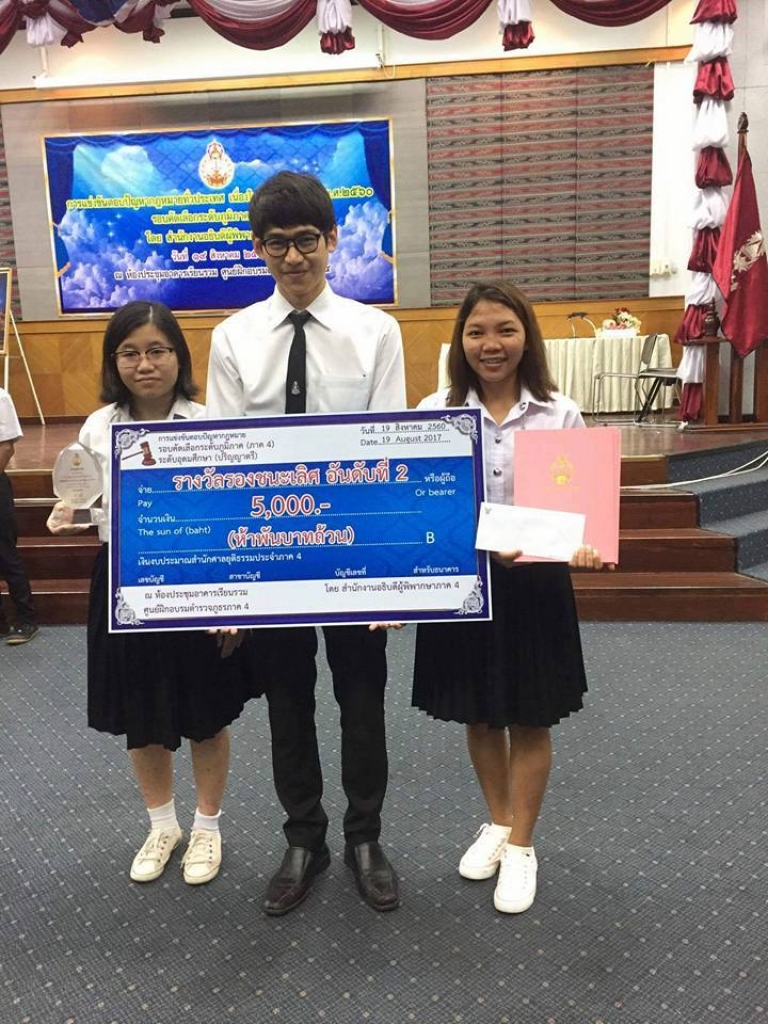 วันที่ 19 สิงหาคม 2560 นำโดย ผศ.สมศักย์ ทองเอี่ยม และ อาจารย์อุษณีย์ ตันสูงเนิน อาจารย์ประจำสาขานิติศาสตร์ นำนักศึกษาสาขานิติศาสตร์ คณะสังคมศาสตร์บูรณาการ มหาวิทยาลัยขอนแก่น วิทยาเขตหนองคาย เข้าร่วมแข่งขันตอบปัญหากฎหมายระดับภูมิภาค (ภาค4) เนื่องในวันรพี ประจำปี 2560 ได้รับรางวัลรองชนะเลิศ อันดับที่ 2 ได้แก่นายวิเชษฐ์ วิริยะวศิน ชั้นปีที่ 4, นางสาวฐิติมา ศรีกะพา ชั้นปีที่ 4และ นางสาวศุจิธรา บุตรเอก ชั้นปีที่ 4 ซึ่งเป็น 1 ในจำนวน 3 ทีม ที่จะได้เข้าร่วมแข่งขันทักษะการตอบปัญหากฎหมายรอบชิงชนะเลิศ (ทั่วประเทศ) ในวันที่ 2 กันยายน 2560 ณ สถาบันพัฒนาข้าราชการฝ่ายตุลาการ ศาลยุติธรรม กรุงเทพมหานคร