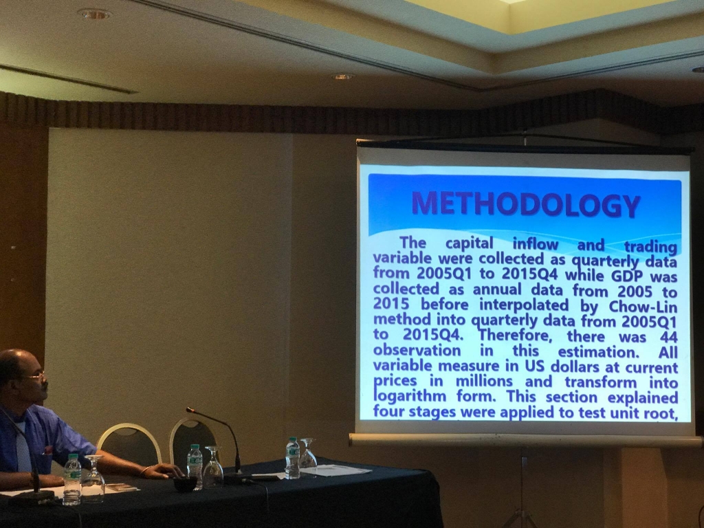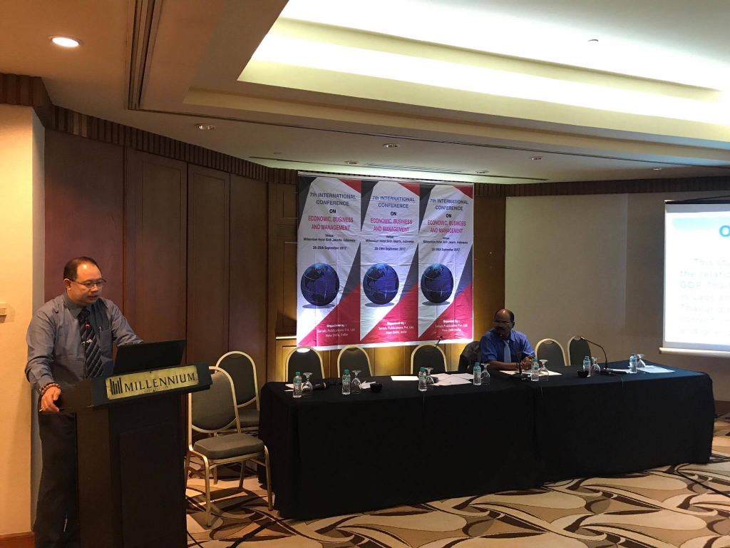เมื่อวันที่ 27-28 กันยายน 2560 ผู้ช่วยศาสตราจารย์ ดร.ธเนศ วัฒนกูล อาจารย์สาขาเศรษฐศาสตร์ คณะสังคมศาสตร์บูรณาการ ได้เข้าร่วมและนำเสนอบทความวิจัย ในการประชุมวิชาการระดับนานาชาติ International Conference of Economic, Business and Management 2017 (ICEBM 2017) ที่ Millennium Hotel กรุง Jakarta ประเทศสาธารณรัฐอินโดนีเซีย โดยนำเสนอบทความเรื่อง Influence of Foreign Direct Investment and Export on Economic Growth of Laos ซึ่งบทความนี้ได้รับการตีพิมพ์ในวารสาร International Journal of Applied Business and Economic Research Volume 15 Number 20 ปี 2017 ที่อยู่ในฐานข้อมูล SCOPUS