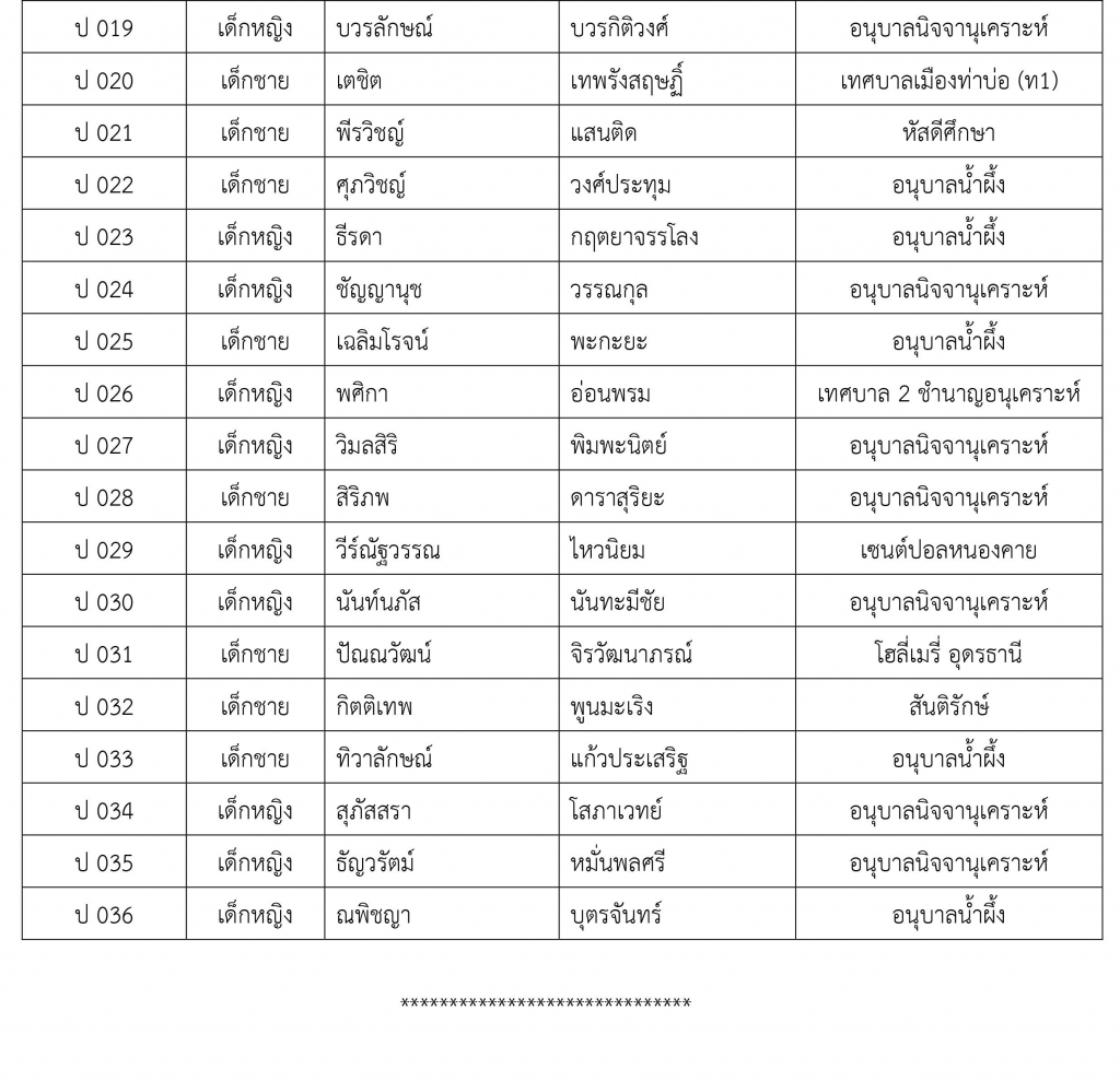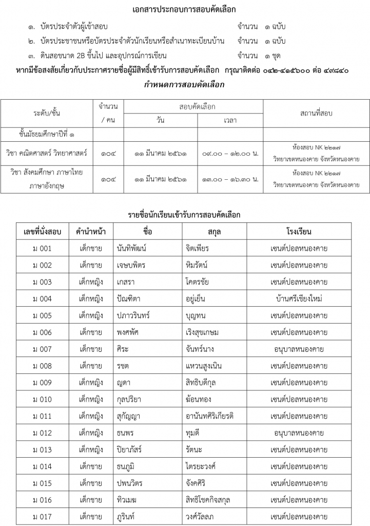 ประกาศรายชื่อผู้มีสิทธิ์เข้ารับการสอบคัดเลือกในการรับสมัครคัดเลือกนักเรียนระดับชั้นประถมศึกษาปีที่ 1 และระดับมัธยมศึกษาปีที่ 1 ประจำปีการศึกษา 2561 โรงเรียนสาธิตมหาวิทยาลัยขอนแก่น วิทยาเขตหนองคาย