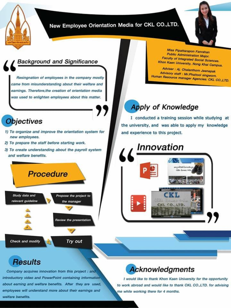 เมื่อวันที่ 21 มิถุนายน 2561 ณ คณะบริหารธุรกิจและการบัญชี มหาวิทยาลัยขอนแก่น นางสาวพิภัทธาพร ฝั่นระหันต์ นักศึกษาสาขาวิชารัฐประศาสนศาสตร์ คณะสังคมศาสตร์บูรณาการ มหาวิทยาลัยขอนแก่น วิทยาเขตหนองคาย คว้ารางวัล Poster ชนะเลิศ (เงินรางวัลพร้อมเกียรติบัตร) ประเภทกลุ่มมนุษยศาสตร์และสังคมศาสตร์ ในโครงการนำเสนอและประกวดผลงานสหกิจอาเซียน ประจำภาคปลาย ปีการศึกษา 2561 ภายใต้ชื่อผลงาน การเตรียมความพร้อมพนักงานก่อนเข้ารับการบรรจุ บริษัท ซีเคแอล จำกัด (New Employee Orientation Media for CKL CO.,LTD.) โดยมีอาจารย์ชลันธร จีนาภักดิ์ อาจารย์ประจำสาขาวิชารัฐประศาสนศาสตร์ เป็นอาจารย์ที่ปรึกษา