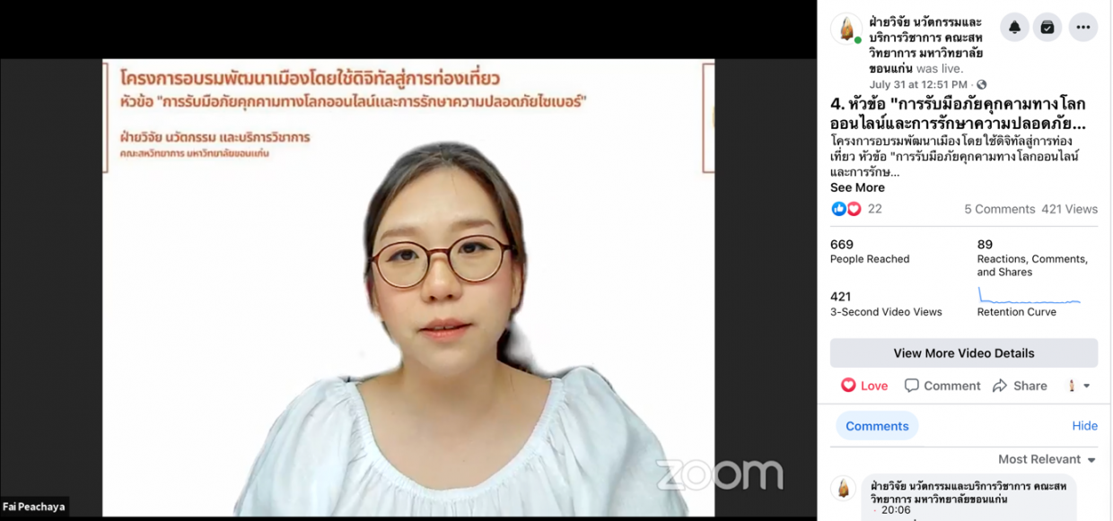 5.การสร้าง การรักษาอัตลักษณ์ที่ดีในโลกออนไลน์ และการใช้สื่อเทคโนโลยีอย่างสร้างสรรค์ จัดขึ้นในวันที่ 3 สิงหาคม 2564 วิทยากรโดย รองศาสตราจารย์ ดร.ชญาดา สุระวนิชกุล และดำเนินการเสวนาโดย ผู้ช่วยศาสตราจารย์ ดร.วัลลภา วงศ์ศีลธรรม อาจารย์ประจำหลักสูตรปรัชญาดุษฎีบัณฑิต สาขาวิชาวิศวกรรมไฟฟ้าและคอมพิวเตอร์ หลักสูตรนานาชาติ คณะสหวิทยาการ มหาวิทยาลัยขอนแก่น วิทยาเขตหนองคาย หัวข้อนี้ มุ่งเน้นเพื่อส่งเสริมให้ผู้ประกอบการธุรกิจมีความสามารถในการใช้สื่อดิจิทัลเพื่อสร้างอัตลักษณ์ที่ดีของธุรกิจในโลกออนไลน์ และส่งเสริมการออกแบบแนวคิดการสร้างแบรนด์ของตนเองให้เป็นที่จดจำในโลกออนไลน์ รวมถึงแนวทางการสร้างคอนเทนต์ของแบรนด์เพื่อสื่อสารและส่งเสริมธุรกิจของผู้ประกอบการได้อย่างมีประสิทธิภาพและเกิดประโยชน์สูงสุด