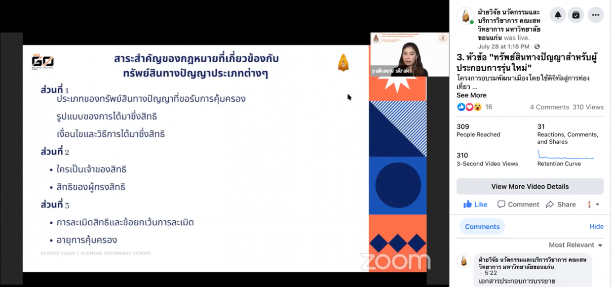 3.ทรัพย์สินทางปัญญาสำหรับผู้ประกอบการรุ่นใหม่ จัดขึ้นในวันที่ 28 กรกฎาคม 2564 วิทยากรโดยอาจารย์ ดร.ใยแก้ว ศีลรักษ์ อาจารย์ประจำภาควิชามนุษยศาสตร์และสังคมศษสตร์ คณะศิลปะศาสตร์ สถาบันเทคโนโลยีพระจอมเกล้าเจ้าคุณทหารลาดกระบัง หัวข้อนี้เป็นการอบรมเชิงปฏิบัติการเพื่อเปิดแนวความคิดโลกธุรกิจที่เกี่ยวข้องกับการท่องเที่ยว ถึงความเชื่อมโยงของทรัพย์สินทางปัญญาที่สามารถสร้างมูลค่าเพิ่มแก่ผู้ประกอบการธุรกิจได้ ทั้งในส่วนของเครื่องหมายทางการค้า ลิขสิทธิ์ สิทธิบัตร หรือความลับทางการค้า