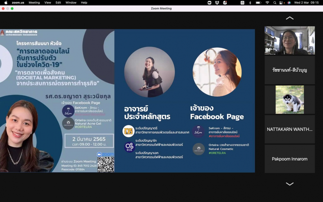 วันพุธ ที่ 2 มีนาคม 2564 เวลา 09.00-12.00 น. คณะสหวิทยาการ มหาวิทยาลัยขอนแก่น หลักสูตรนวัตกรรมการท่องเที่ยวและการบริการ จัดโครงการสัมมนาในหัวข้อ “การตลาดออนไลน์กับการปรับตัวในช่วงโควิด-19”และ“การตลาดเพื่อสังคมจากประสบการณ์ตรงการทำธุรกิจ” (รูปแบบออนไลน์) โดยเชิญ รองศาสตราจารย์ ดร.ชญาดา สุระวนิชกุล มาให้ความรู้และประสบการณ์ตรงจากการทำธุรกิจในรูปแบบการตลาดออนไลน์ในช่วงสถานการณ์โควิด-19 และมาแชร์ประสบการณ์การทำงานร่วมกับชุมชนโดยเน้นการให้คุณค่าคืนสู่ชุมชน การรับฟังสัมมนาในครั้งนี้นักศึกษาได้มุมมองจากวิทยากรในการทำธุรกิจจริงให้เห็นภาพทั้งกระบวนการทำการตลาดออนไลน์และการปรับรูปแบบทางธุรกิจจากสถานการณ์ปัจจัยภายนอกเช่น โควิด-19 นอกจากนั้นวิทยากรยังได้มีการให้ความรู้แนวโน้มเทรนด์โลกในการทำการตลาดพร้อมสอดแทรกแง่คิดและแรงบันดาลใจให้กับนักศึกษา การสัมมนาครั้งนี้มีการเปิดโอกาสให้กับผู้ที่สนใจจากภายนอกเข้าร่วมรับฟังแลกเปลี่ยนประสบการณ์ ซึ่งในช่วงปิดท้ายการสัมมนามีการสรุปและแชร์ความรู้แง่คิดที่ได้จากการสัมมนาครั้งนี้อีกด้วย