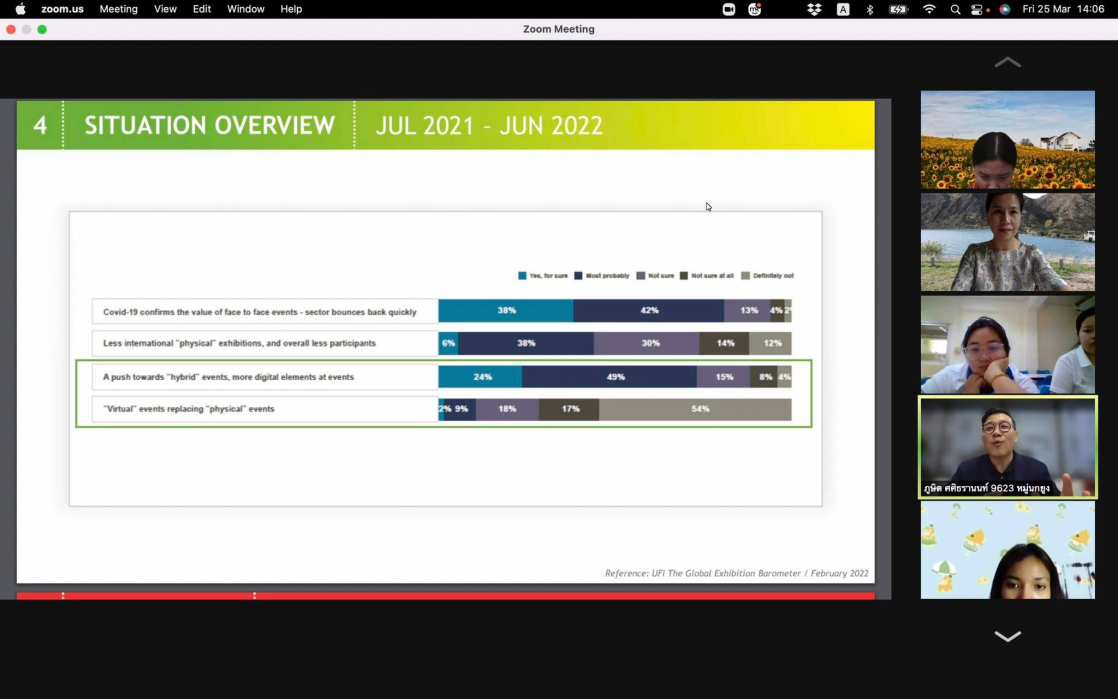 เมื่อวันศุกร์ ที่ 25 มีนาคม 2565 เวลา 13.30-16.30น. ที่ผ่านมา หลักสูตรการท่องเที่ยวและอุตสาหกรรมการบริการ คณะสหวิทยาการ มหาวิทยาลัยขอนแก่น จัดโครงการบรรยายในหัวข้อ “Exhibition Business: Impact of the Covid-19 and Business Sector Transformation” โดยเรียนเชิญ คุณภูษิต ศศิธรานนท์ กรรมการผู้จัดการ บริษัท Expolink Global Network ผู้บุกเบิกธุรกิจExhibition ในประเทศไทย มาให้ความรู้ด้านธุรกิจการจัดแสดงสินค้าและนิทรรศการ และถ่ายทอดประสบการณ์ตรงจากการทำธุรกิจ วิทยากรได้นำกรณีศึกษาการจัดexhibition ทั้งในประเทศและต่างประเทศที่น่าสนใจมาถ่ายทอดให้นักศึกษาและผู้เข้าร่วมที่สนใจได้รับฟัง รวมถึงสถานการณ์แนวโน้มและการปรับตัวทางธุรกิจจากสถานการณ์โควิด-19