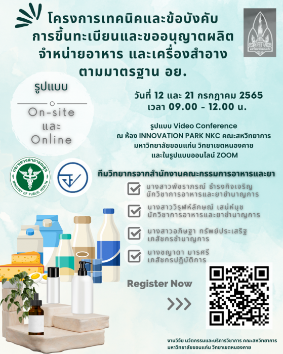 ในวันที่ 12 และ 21 กรกฎาคม 2565 งานวิจัย นวัตกรรมและบริการวิชาการ คณะสหวิทยาการ ได้จัด “โครงการเทคนิคและข้อบังคับการขึ้นทะเบียนและขออนุญาตผลิต จำหน่ายอาหาร และเครื่องสำอางตามมาตรฐาน อย.” ในรูปแบบออนไลน์ผ่านโปรแกรม Zoom Meeting และการอบรมผ่านระบบ Video Conference ณ ห้อง Innovation Park NKC คณะสหวิทยาการ มหาวิทยาลัยขอนแก่น โดยมี ผู้ช่วยศาสตราจารย์ ดร.สุนทรี บูชิตชน รองคณบดีคณะสหวิทยาการ เป็นประธานในการกล่าวเปิดงานโครงการ