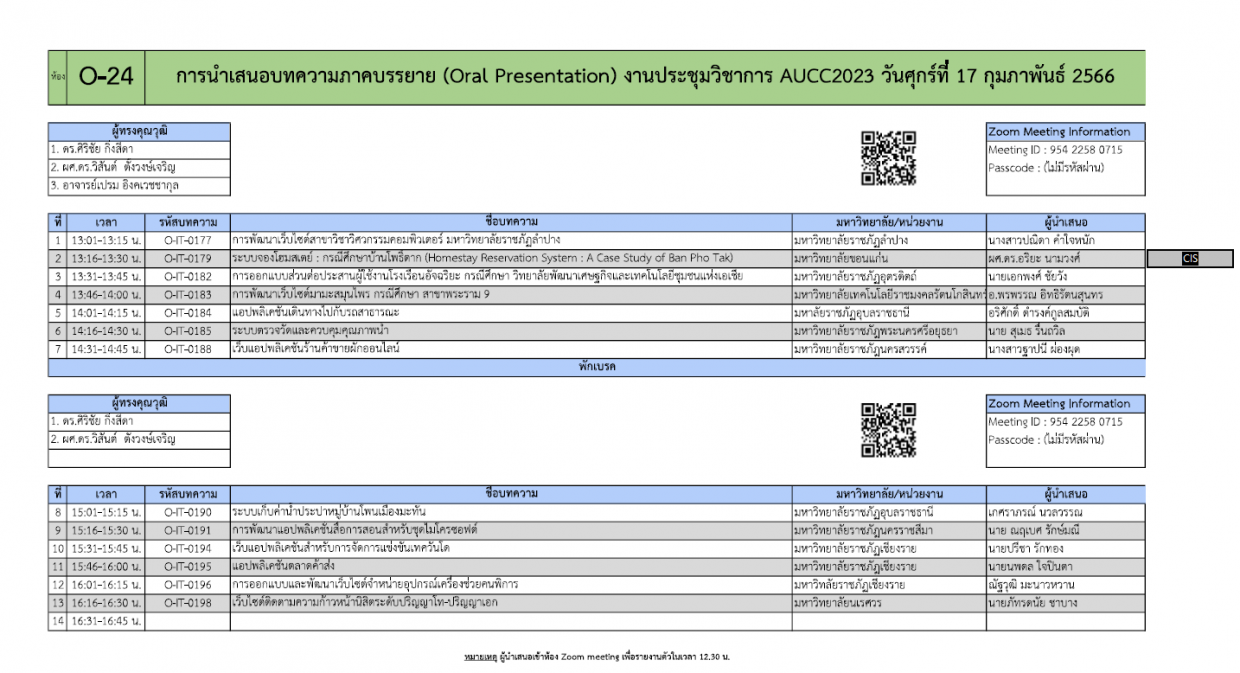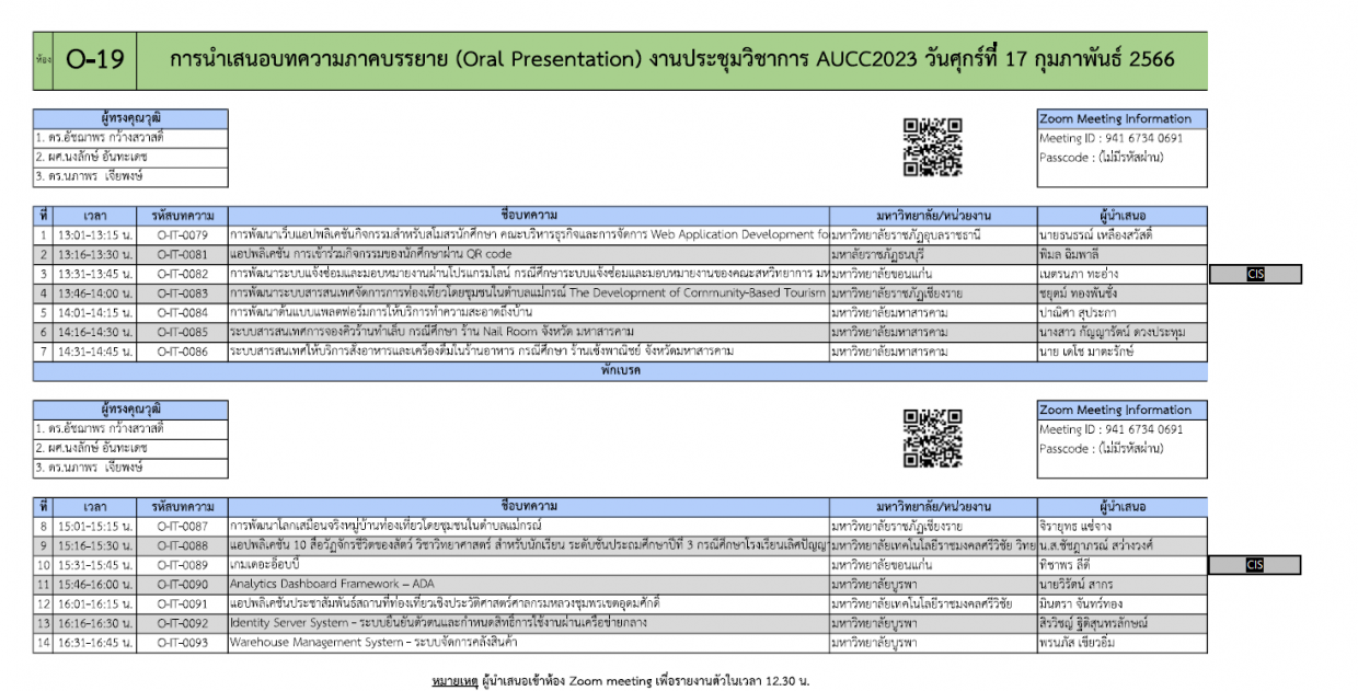 วันที่ 16 - 18 กุมภาพันธ์ 2566 หลักสูตรวิทยาการคอมพิวเตอร์และสารสนเทศ สาขาวิชาเทคโนโลยีและวิศวกรรมศาสตร์ คณะสหวิทยาการ มหาวิทยาลัยขอนแก่น ได้ส่งนักศึกษา ชั้นปีที่ 4 เข้าร่วมนำเสนอผลงานนวัตกรรมเทคโนโลยีคอมพิวเตอร์ ในการประชุมวิชาการระดับปริญญาตรีด้านคอมพิวเตอร์ภูมิภาคเอเชีย ครั้งที่ 11 (AUCC2023) ณ มหาวิทยาลัยราชภัฏนครสวรรค์ จ.นครสวรรค์ (Online Virtual) และได้เข้าร่วมนำเสนอผลงานนวัตกรรมเทคโนโลยีคอมพิวเตอร์ ในวันที่ 17 กุมภาพันธ์ 2566 ทั้งหมด จำนวน 7 กลุ่ม ดังตารางต่อไปนี้