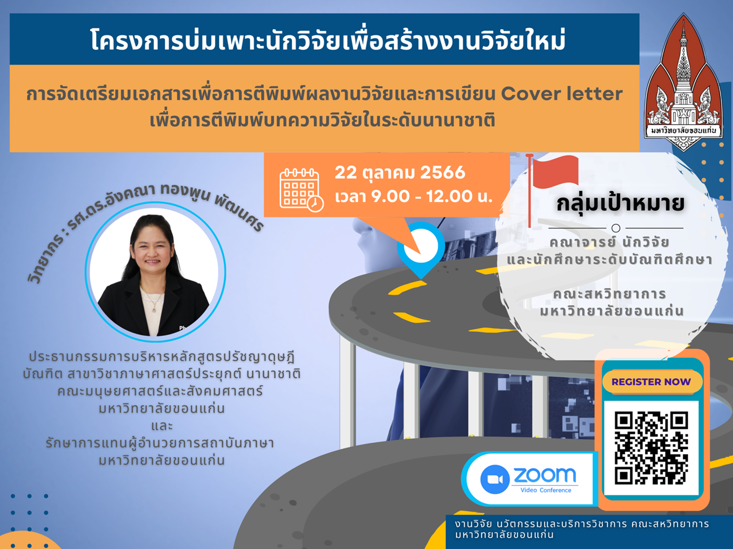 วันที่ 22 ตุลาคม 2566 ณ คณะสหวิทยาการ มหาวิทยาลัยขอนแก่น จัดโครงการบ่มเพาะนักวิจัยเพื่สร้างงานวิจัยใหม่ (ในรูปแบบออนไลน์) ระยะที่ 1 การเตรียมเอกสารเพื่อการตีพิมพ์ระดับนานาชาติ ผู้รับผิดชอบโครงการงานวิจัย นวัตกรรมและบริการวิชาการ ผู้ช่วยศาสตราจารย์ ดร.สุนทรี บูชิตชน รองคณบดีคณะสหวิทยาการ มหาวิทยาลัยขอนแก่น และได้รับเกียรติจากวิทยาการ รองศาสตราจารย์ ดร.อังคณา ทองพูน พัฒนศร ประธานกรรมการบริหารหลักสูตรปรัชญาดุษฎีบัณฑิต สาขาวิชาภาษาศาสตร์ประยุกต์ นานาชาติ อบรมเชิงปฏิบัติการ หัวข้อ “การจัดเตรียมเอกสารเพื่อการตีพิมพ์ผลงานวิจัยและการเขียน Cover letter เพื่อการตีพิมพ์บทความวิจัยในระดับนานาชาติ”