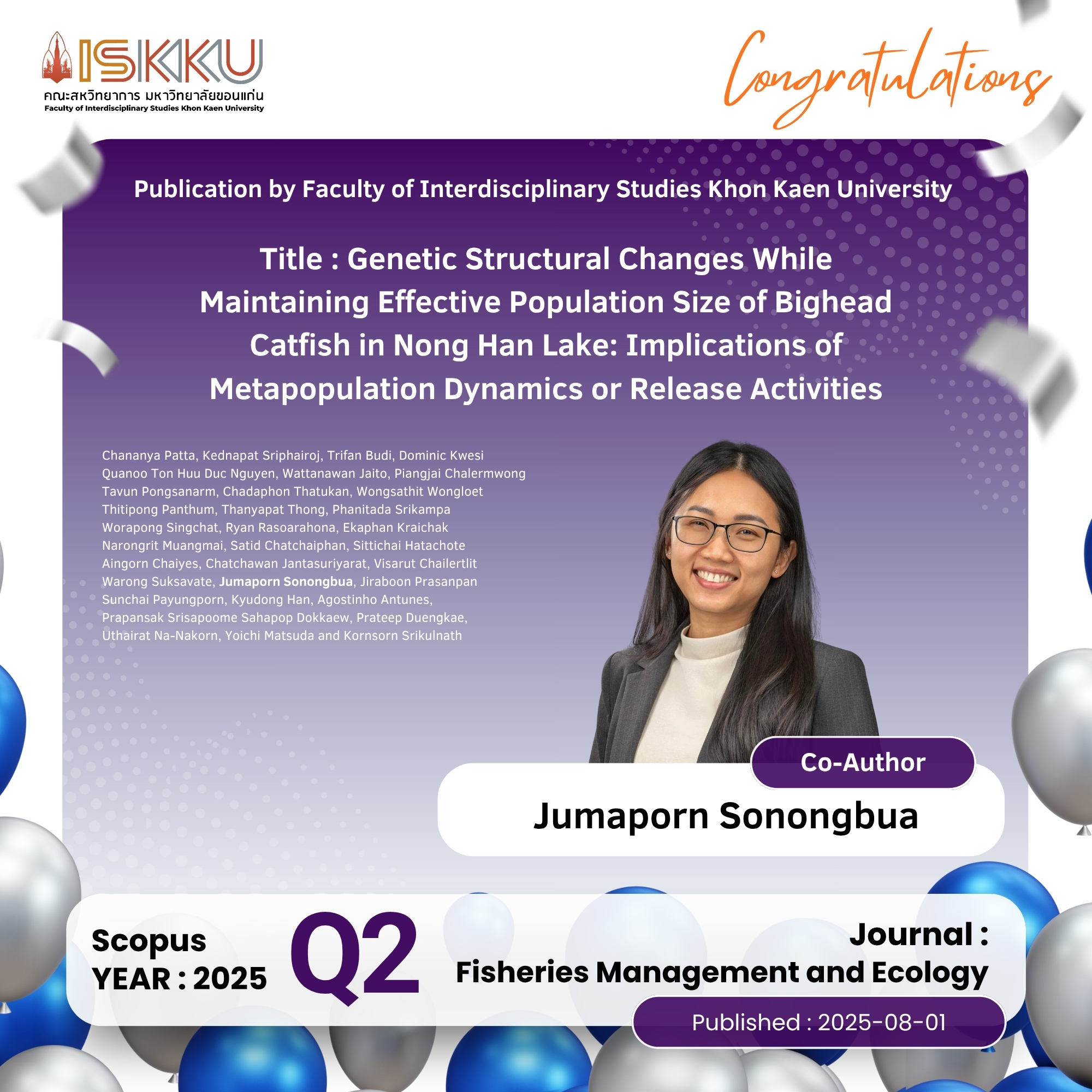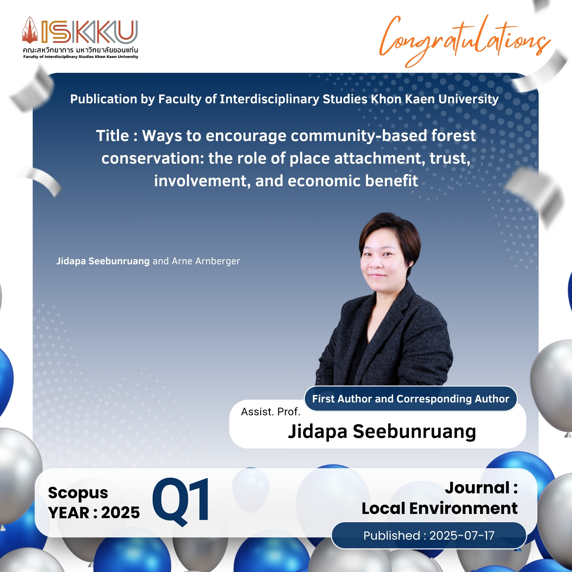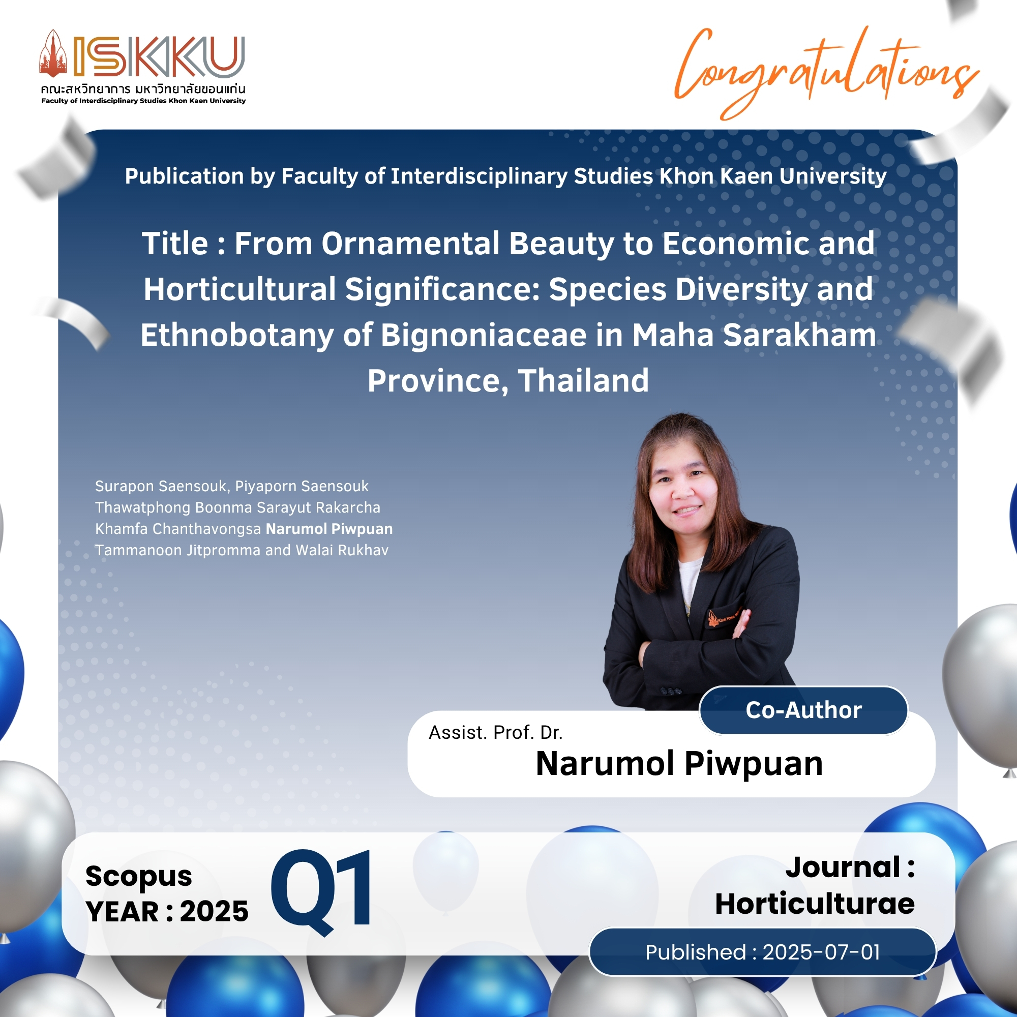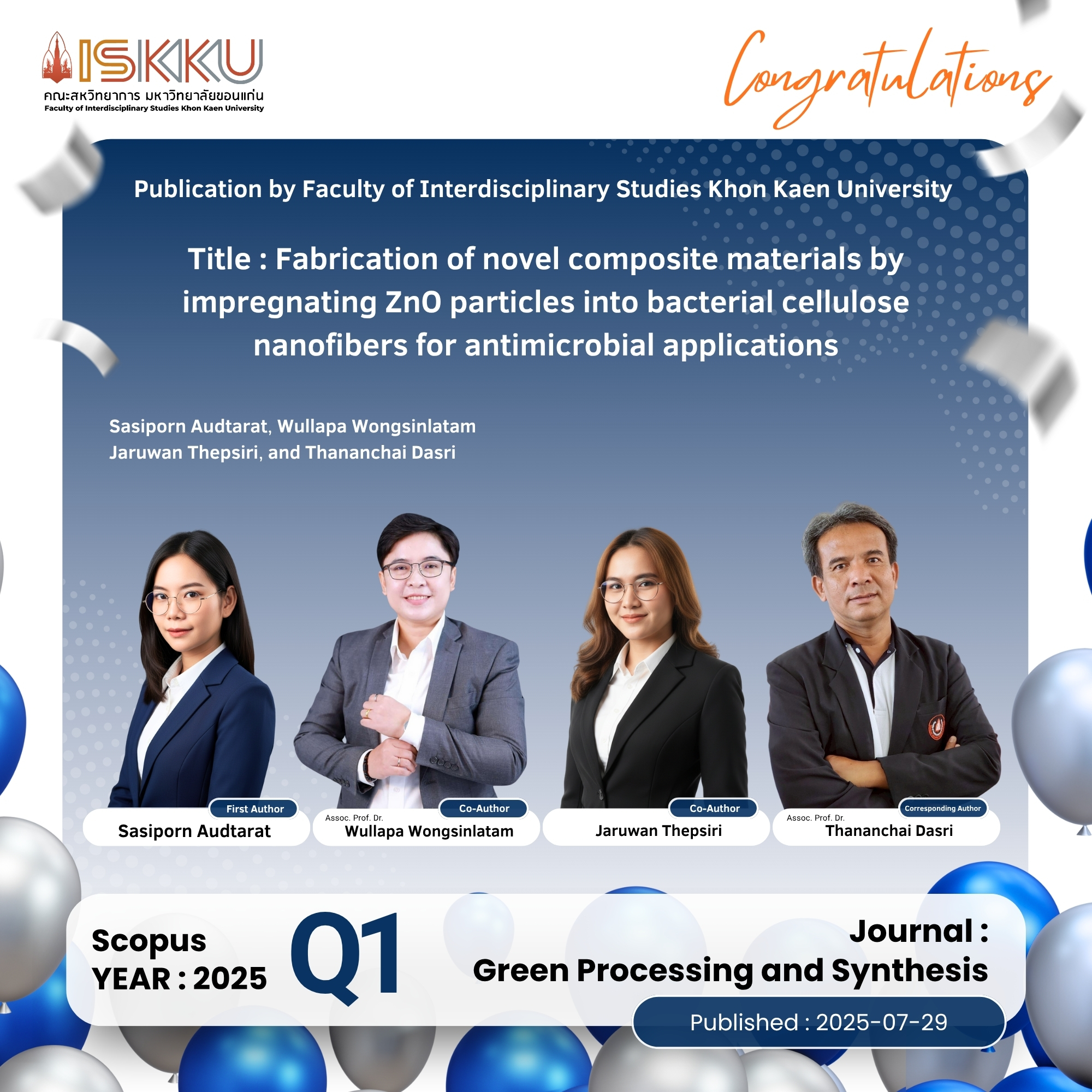 คณะสหวิทยาการ มหาวิทยาลัยขอนแก่น ขอแสดงความยินดีกับคณาจารย์ในโอกาสที่ได้รับการตีพิมพ์วารสารวิชาการระดับนานาชาติ ที่ปรากฎในฐานข้อมูล Scopus Q1 ,Q2 , Q3, Q4 ตั้งแต่วันที่ 1 กรกฎาคม 2568 - 30 กันยายน 2568