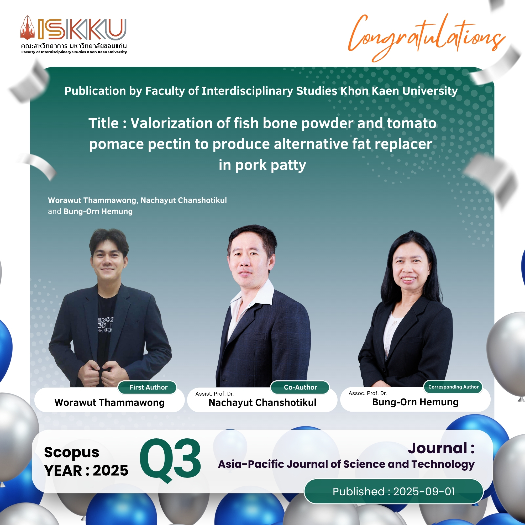 คณะสหวิทยาการ มหาวิทยาลัยขอนแก่น ขอแสดงความยินดีกับคณาจารย์ในโอกาสที่ได้รับการตีพิมพ์วารสารวิชาการระดับนานาชาติ