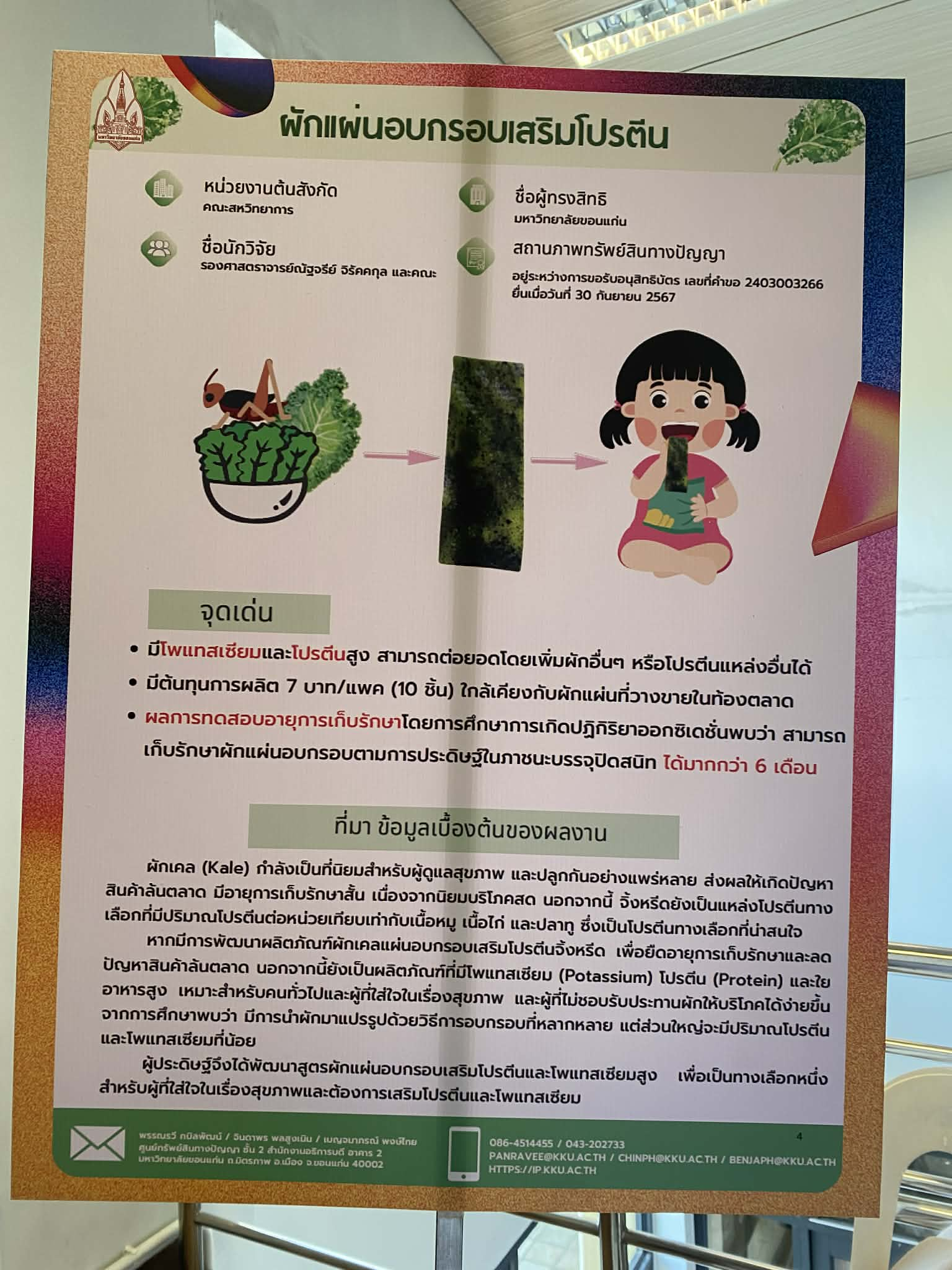 ในโอกาสที่มหาวิทยาลัยขอนแก่นได้รับจัดสรรพื้นที่บูธขนาดใหญ่จำนวน 30–40 บูธ เพื่อจัดแสดงศักยภาพงานวิจัย คณะสหวิทยาการ มข. ได้รับความสนใจเป็นพิเศษในการนำเสนอ “ผลิตภัณฑ์ผักแผ่นอบกรอบ” ซึ่งเป็นนวัตกรรมที่ถูกพัฒนาขึ้นเพื่อตอบสนองเทรนด์สุขภาพและความต้องการอาหารว่างที่มีคุณค่าทางโภชนาการสูง แต่มีแคลอรี่ต่ำ
