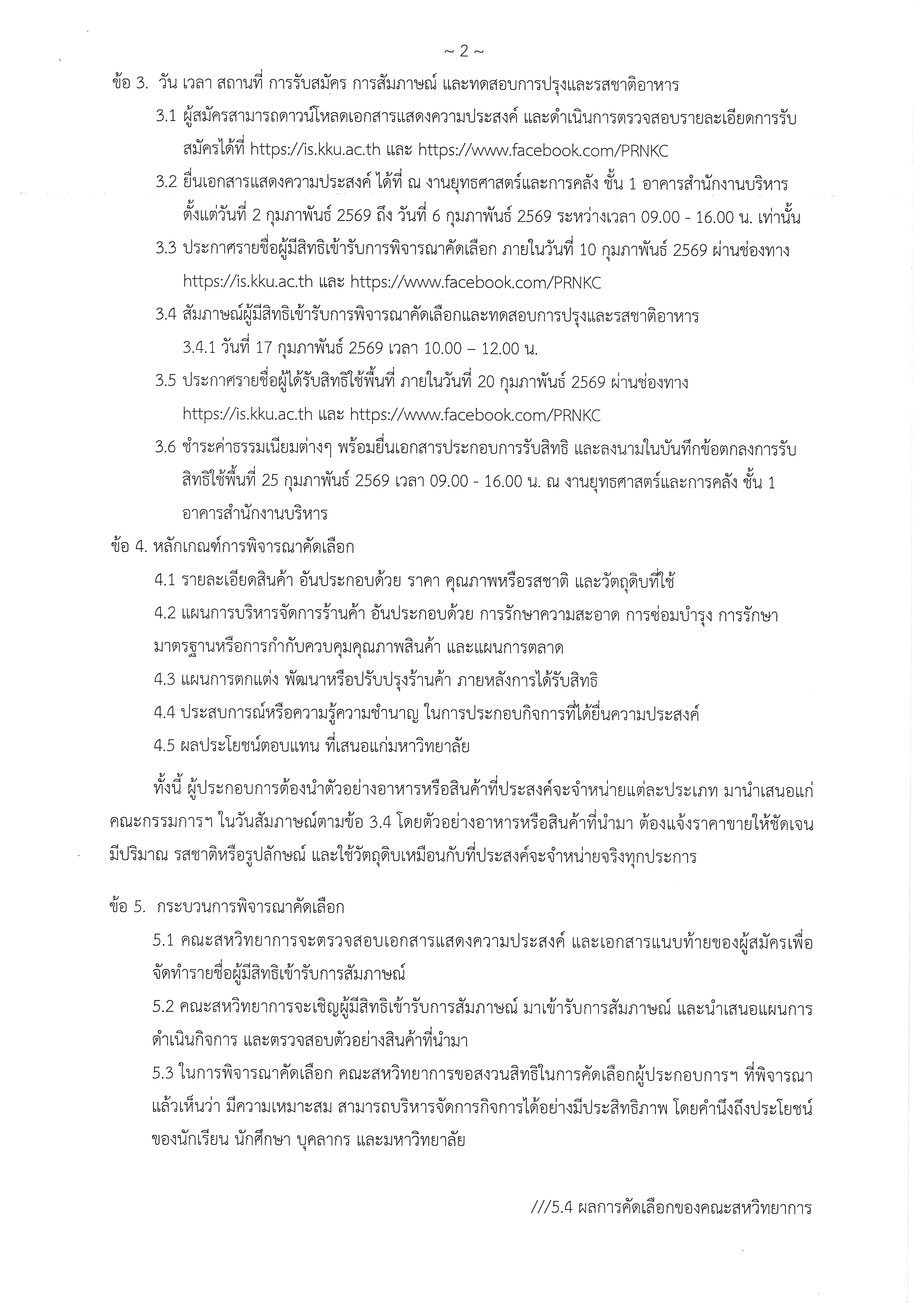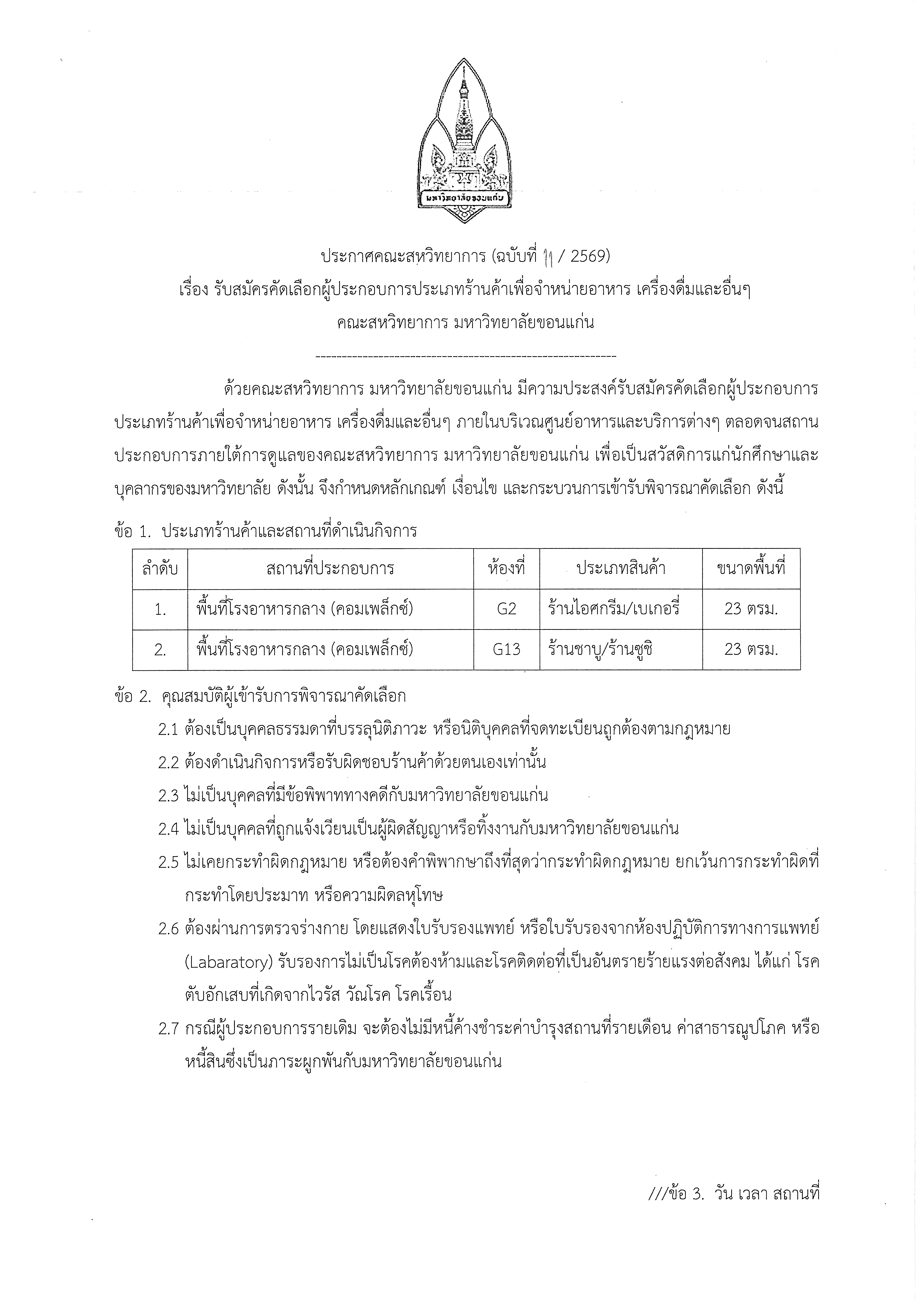 ประกาศคณะสหวิทยาการ ฉบับที่ 11/2569 เรื่อง รับสมัครคัดเลือกผู้ประกอบการประเภทร้านค้าเพื่อจำหน่ายอาหาร เครื่องดื่มและอื่นๆ คณะสหวิทยาการ มหาวิทยาลัยขอนแก่น