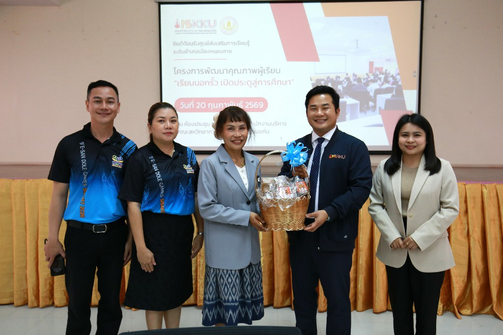 เมื่อวันที่ 20 กุมภาพันธ์ 2569 ณ ห้องประชุม NK1407 ชั้น 4 อาคารสำนักงานบริหาร คณะสหวิทยาการ มหาวิทยาลัยขอนแก่น ได้จัดกิจกรรมต้อนรับคณะครูและนักเรียนจากศูนย์ส่งเสริมการเรียนรู้ (สกร.) ระดับอำเภอเมืองหนองคาย ในโอกาสเข้าเยี่ยมชมและศึกษาดูงานภายใต้โครงการพัฒนาคุณภาพผู้เรียน “เรียนนอกรั้ว เปิดประตูสู่การศึกษา” โดยมี อาจารย์จักรวาล กลีบบัว รองคณบดีคณะสหวิทยาการ พร้อมด้วย ดร.อุษณีย์ ตันสูงเนิน ผู้ช่วยคณบดี และบุคลากรของคณะฯ ร่วมให้การต้อนรับ นางสาวฐปนา อินทร์มา ผู้อำนวยการ สกร.ระดับอำเภอเมืองหนองคาย และคณะผู้เยี่ยมชมอย่างอบอุ่น
