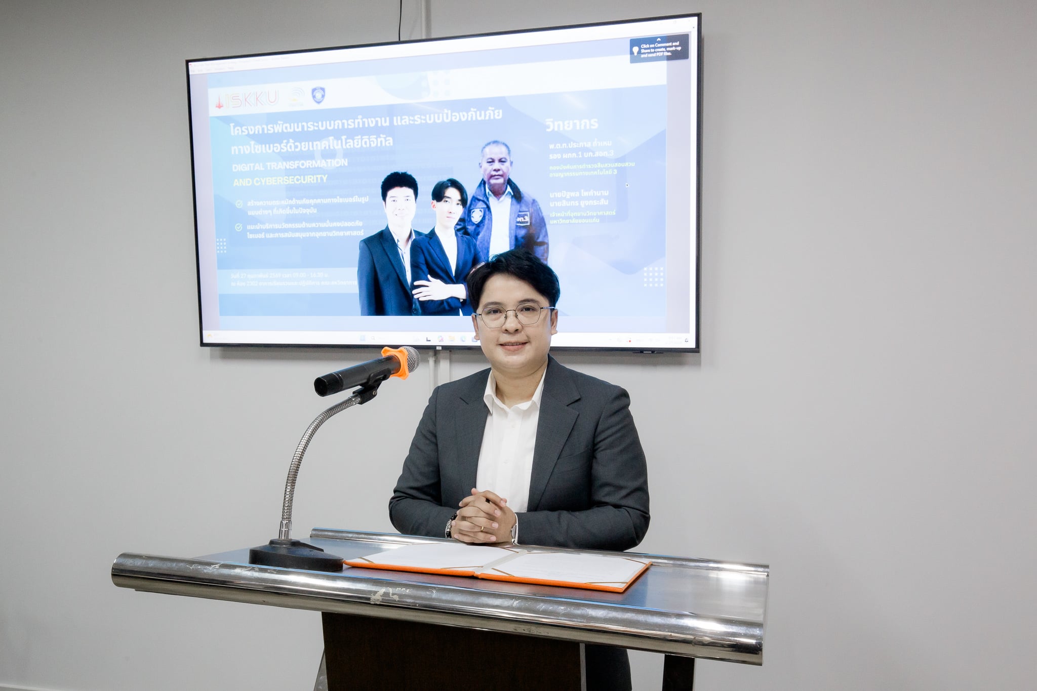 ปิดท้ายด้วยการนำเสนอ "บริการนวัตกรรมด้านความมั่นคงปลอดภัยไซเบอร์" วิทยากรโดย นายปัฐพล ไพคำนาม และ นายสินทร ยูงกระสัน เจ้าหน้าที่อุทยานวิทยาศาสตร์ มหาวิทยาลัยขอนแก่น ที่แนะนำเครื่องมือและการสนับสนุนที่หน่วยงานพร้อมให้บริการแก่ผู้ประกอบการและองค์กรที่ต้องการยกระดับความมั่นคงปลอดภัยทางดิจิทัล