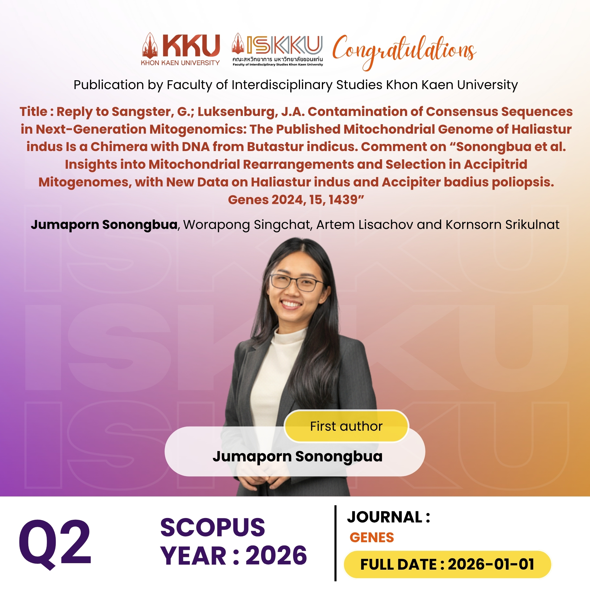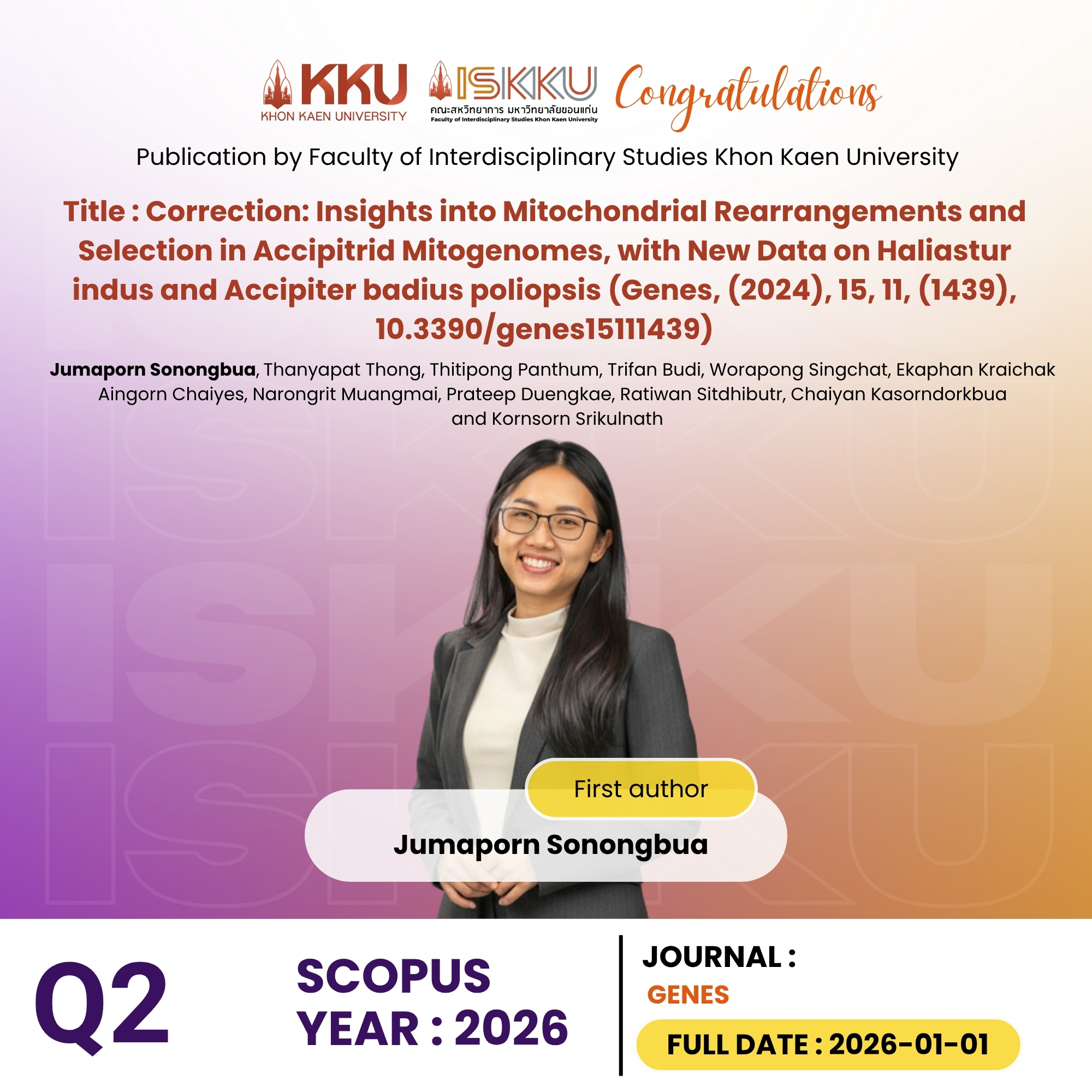 คณะสหวิทยาการ มหาวิทยาลัยขอนแก่น ขอแสดงความยินดีกับคณาจารย์และนักศึกษาระดับบัณฑิตศึกษา ในโอกาสที่ได้รับการตีพิมพ์วารสารวิชาการระดับนานาชาติ ที่ปรากฎในฐานข้อมูล Scopus Q1 , Q2 , Q3 ตั้งแต่วันที่ 1 มกราคม - 31 มีนาคม 2569 โดยอ้างอิงจากวัน Full Date วารสาร