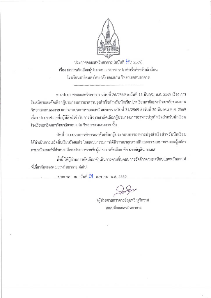 ประกาศคณะสหวิทยาการ (ฉบับที่ 35/2569) เรื่อง ผลการคัดเลือกผู้ประกอบการอาหารปรุงสำเร็จสำหรับนักเรียน โรงเรียนสาธิตมหาวิทยาลัยขอนแก่น วิทยาเขตหนองคาย