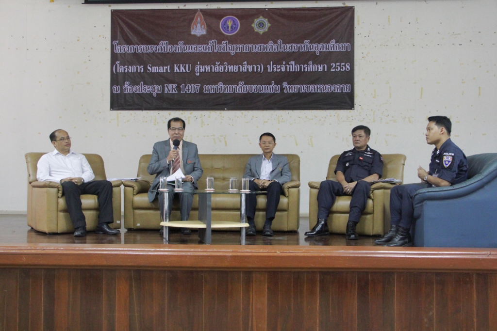 มื่อวันที่ 18 สิงหาคม 2558 เวลา 09.00 น. ณ ห้องประชุม NK 1407 อาคารสำนักงานบริหาร วิทยาเขตหนองคาย ผู้ช่วยศาสตราจารย์ ดร.เกียรติ แสงอรุณ รองอธิการบดีวิทยาเขตหนองคาย เป็นประธานกล่าวเปิดโครงการ Smart KKU สู่มหาวิทยาลัยสีขาว โดยในช่วงเช้าได้จัดเสวนาในหัวข้อ “Smart KKU สู่มหาวิทยาลัยสีขาว “ สถานการณ์ความเสี่ยงด้านยาเสพติดและภาวะภัยคุกคาม มีผศ.ดร.เกียรติ แสงอรุณ รองอธิการบดีวิทยาเขตหนองคาย พ.ต.อ.จารุพล ยี่ตัน รองผู้บังคับการตำรวจภูธรจ.หนองคาย รตอ.อภิชาติ คลธา รอง.สว.ตม.จังหวัดหนองคายและนายสมปอง เที่ยงมนต์ รองปลัดจังหวัดหนองคาย ฝ่ายป้องกัน เป็นวิทยากรเสวนา โดยมี ดร.เชวงศักดิ์ พฤกษเทเวศ อาจารย์ประจำคณะศิลปศาสตร์ ดำเนินรายการ การเสวนาใหัวข้อ “เส้นทางการลำเลียงยาเสพติดและสถานการณ์ยาเสพติดในพื้นที่” มี นายอดุล ประยูรสินธุ ผอ.ส่วนประสานพื้นที่ สำนักงาน ปปส.ภาค 4 รตท.ภาณุสิษฐ์ ขันติ ผบ.มว.มวลชนสัมพันธ์ ร้อย245(กอ.รมน.)จังหวัดหนองคายและ ดร.เชวงศักดิ์ พฤกษเทเวศ อาจารย์ประจำคณะศิลปศาสตร์ เป็นวิทยากรเสวนา ดำเนินรายการโดยนายเอกวุฒน์ นามลิวัลย์ บุคลากรสำนักงานวิทยาเขตหนองคาย และในภาคบ่าย นักศึกที่เข้าร่วมเป็นอาสาสมัคร ได้เข้ารับฟังบรรยายพิเศษในหัวข้อ “ชุมชนเข้มแข็งต้านภัยยาเสพติด” บรรยายโดย พระครูภาวนาเจติยาภิบาล (ทวี มหาวีโร) เจ้าอาวาสวัดพระธาตุพังพวน และนำนักศึกษา ศึกษาเส้นทางลำเลียงยาเสพติดชายแดนจังหวัดหนองคาย