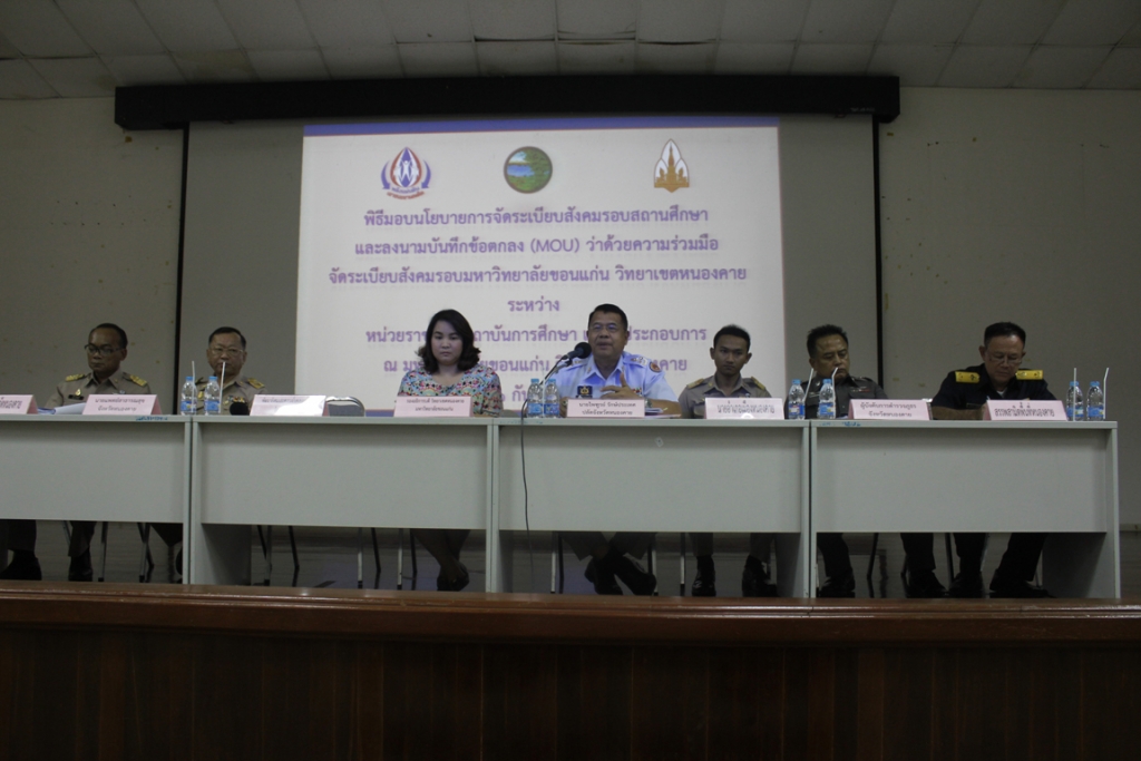 เมื่อวันที่ 21 กันยายน 2558 เวลา 13.30 น. ณ ห้องประชุม NK 1407 อาคารสำนักงานบริหาร วิทยาเขตหนองคาย วิทยาเขตหนองคายร่วมกับหน่วยงานราชการ ผู้ประกอบการรอบวิทยาเขตหนองคาย จัดประชุมชี้แจงการดำเนินโครงการจัดระเบียบสังคมรอบสถานศึกษา (Campus Safety Zone) และพิธีลงนามบันทึกข้อตกลง Memorandum of Understanding (MOU) ว่าด้วยความร่วมมือจัดระเบียบสังคมรอบรอบ วิทยาเขตหนองคาย มหาวิทยาลัยขอนแก่น โดยมีนายสุชาติ นพวรรณ ผู้ว่าราชการจังหวัดหนองคาย ผศ.ดร.เกียรติ แสงอรุณ รองอธิการบดีวิทยาเขตหนองคาย อาจารย์ชาติภร เมืองโคตร มุงคุณแสน ผู้ช่วยอธิการบดีวิทยาเขตหนองคาย นายไพฑูรย์ รักษ์ประเทศ ปลัดจังหวัดหนองคาย วัฒนธรรมจังหวัดหนองคาย พัฒนาสังคมและความมั่นคงของมนุษย์จังหวัดหนองคายผู้บังคับการตำรวจภูธรจังหวัดหนองคาย สาธารณสุขจังหวัดหนองคาย สรรพสามิตพื้นที่หนองคาย นายอำเภอเมืองหนองคาย และมีผู้ประกอบการหอพัก สถานบันเทิง ร้านเกมส์ ร้านอินเทอร์เน็ต ฯลฯ เข้าร่วมรับฟังและลงนามความร่วมมือในครั้งนี้